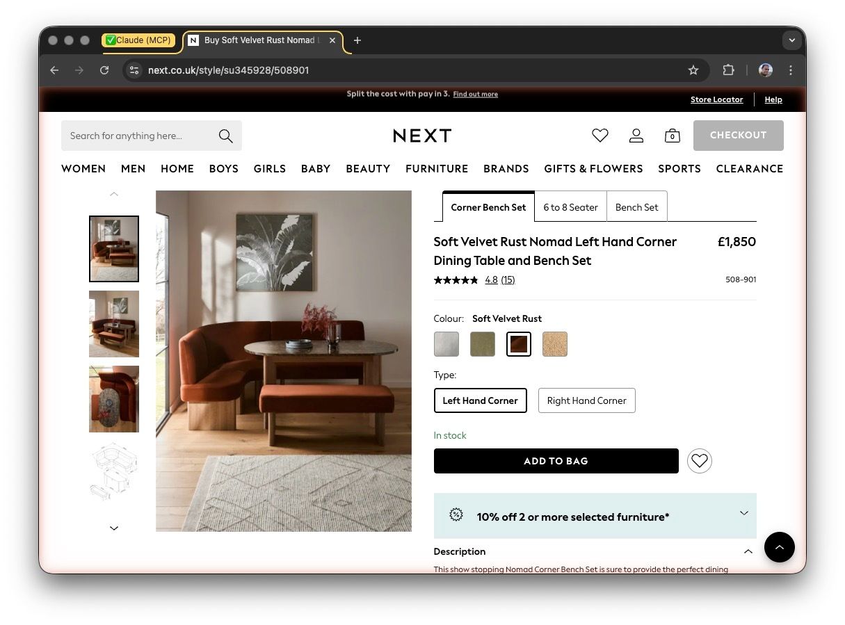 “We're going to do a little project together. I have a theory that you can build much richer product content for ecommerce sites to enable AI and agents to better match a company's product to a user’s intent when they are shopping / discovering new products. I am convinced that using a tool like you, we can create nice rich content from current sources, quite quickly. To prove this through a simple test I want us to use the product on https://www.next.co.uk/style/su345928/508901. It has a very short product description written by the company. In my view it is lacking what AI would need in the future. Let's take this page, and the reviews from customers (there are 15, you might need to hit the 'load more' button to get them all) and make a richer description of this product. Feel free to also examine the images of the product and pick out any details you find to write a richer description. Don't make anything up that you can't see or read about the product. Do think about the different contexts in which the product could be used and what it is really good for.“
