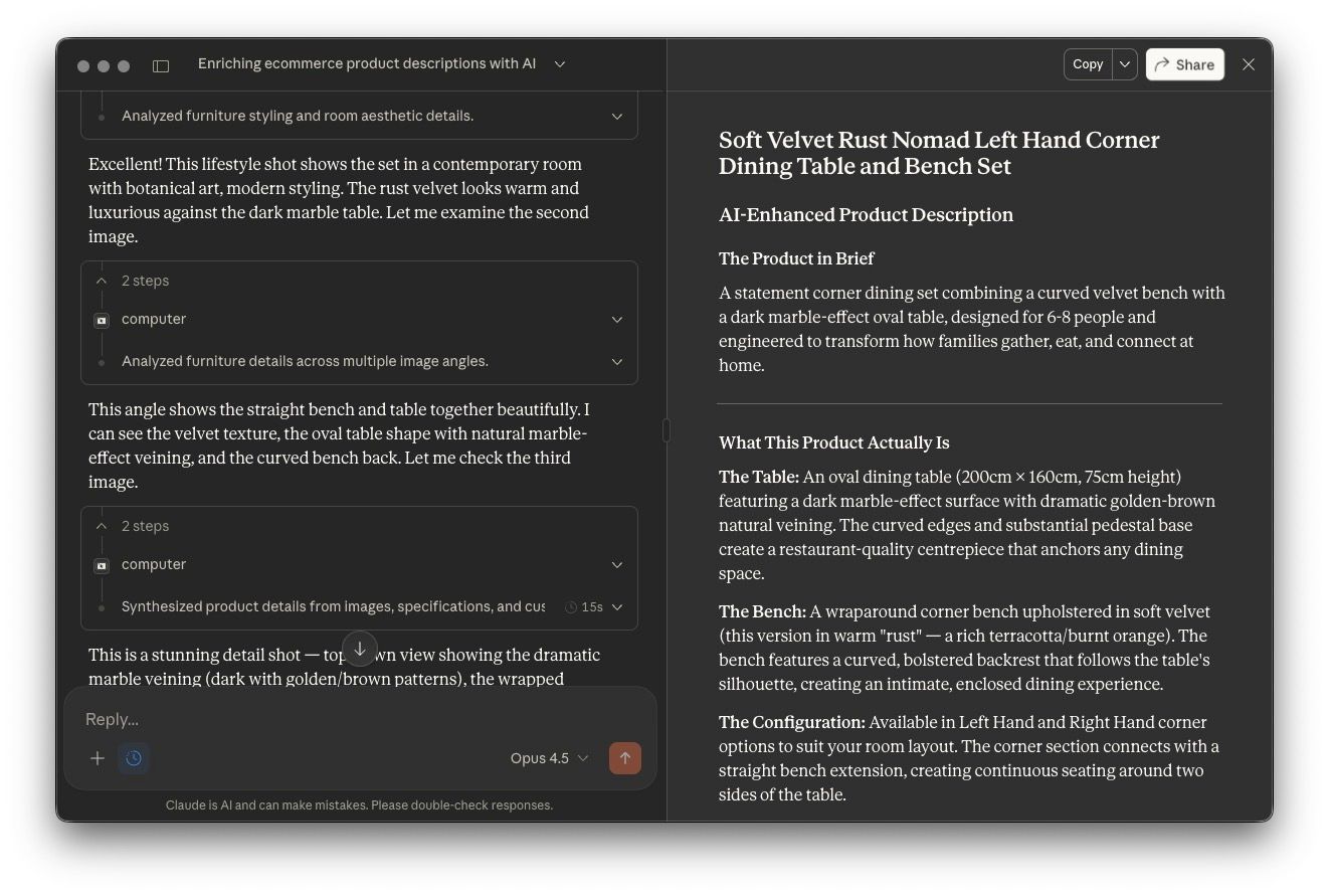 Full text of what it came up with is below. Read it. It did a fantastic job, in my opinion. There’s little hallucination there, it really extracted the content from reviews well. The images: spectacular. The dimensions: not so good, that needs work: I give it a pass because in the image there are three separate items and dimensions: not easy. Overall, refinement to the prompt would include leaning on positive reviews more than negative reviews, really checking measurements, and I would give it brand guidelines / voice. So much potential.